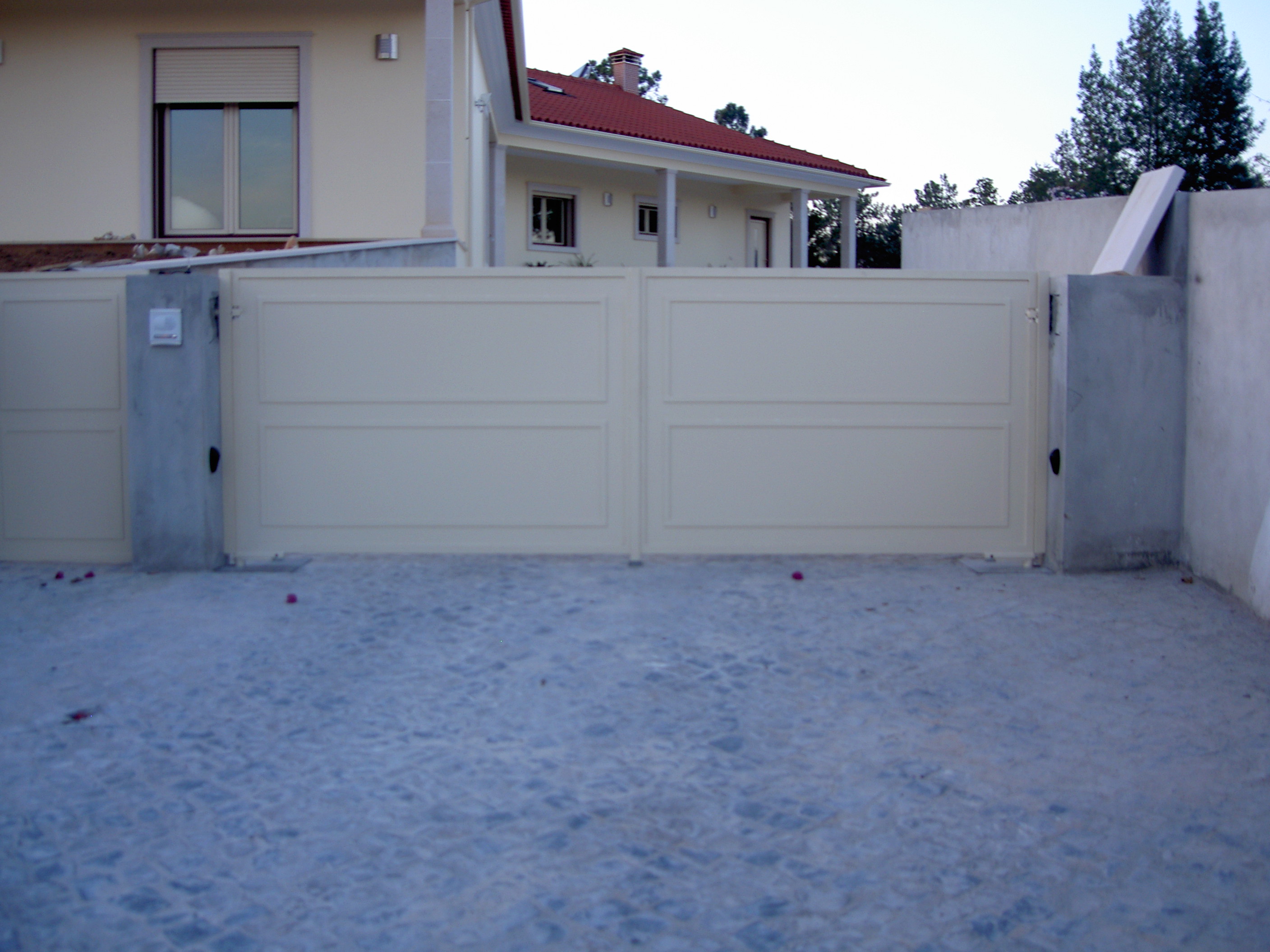 Portão de batente com parte superior a direito, estrutura executada com tubo e revestido com chapa pelo exterior, aplicação de barras decorativas pelo exterior.