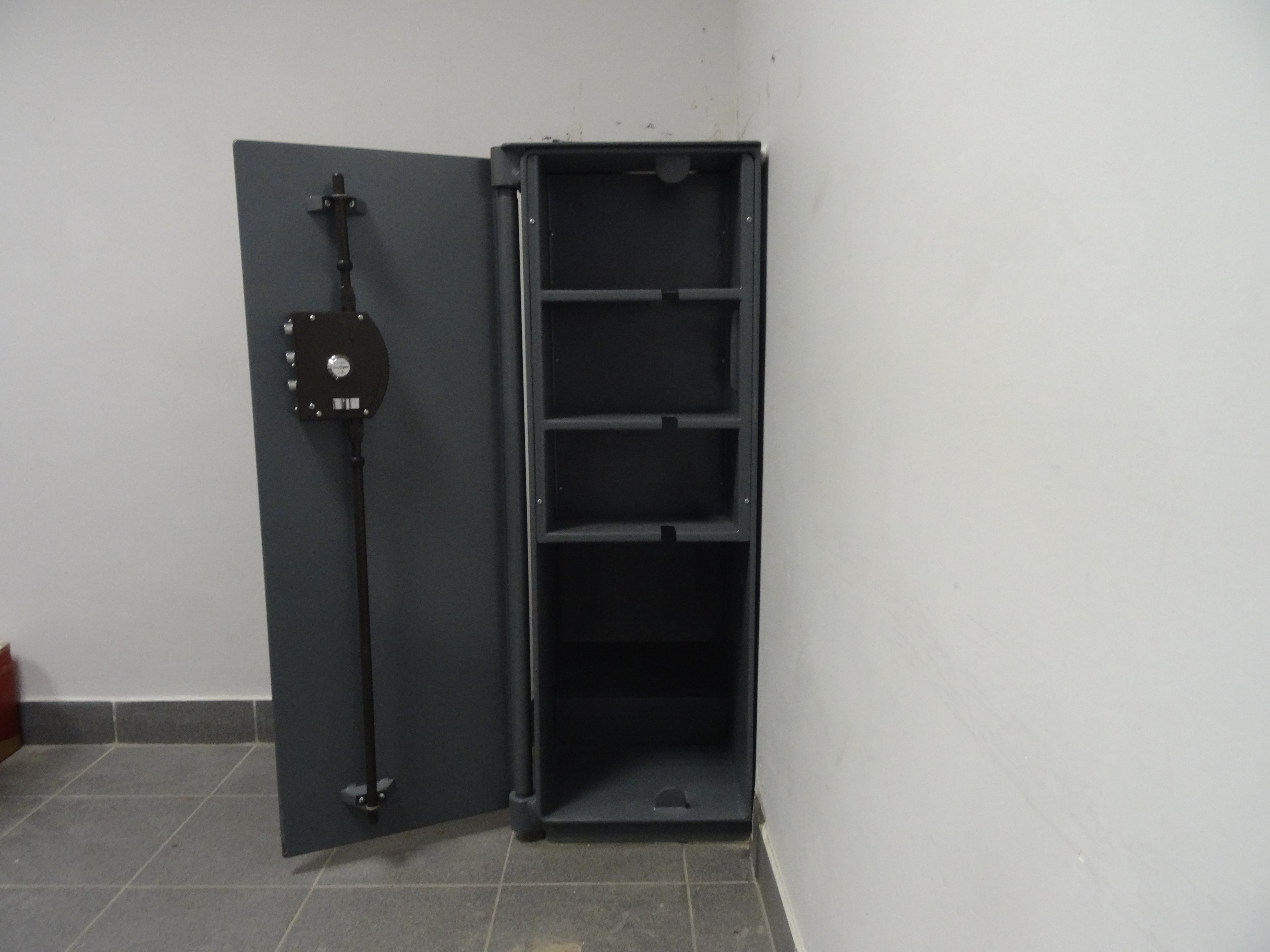 Cofre executado em Perfis Tubulares de secção quadrada e revestido a chapa zincor, equipado com fechadura de segurança.
